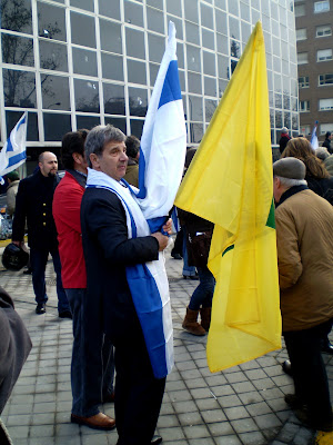 O pasado domingo día 18 tivo lugar en Madrid unha concentración en apoio ao dereito de Israel a autodefensa así como para amosar unha enérxica repulsa polas continuadas agresións terroristas de Hamas. Ao tempo os asistentes manifestaron a súa rotunda desconformidade co tratamento sesgado e en moitas ocasións claramente mentireiro con que grande parte dos medios de comunicación estatais informaron do conflito na Faixa de Gaza. Non faltaron tampouco mostras de rexeitamento ao que se interpretou coma unha feble posición por parte do Goberno español á hora de xulgar as provocacións do terrorismo islamita contra a democracia israelí. O acto deu comezo ás 12:30 e congregou diante da Embaixada de Israel a unhas 3.000 persoas. Desde Galiza a Asociación Galega de Amizade con Israel-AGAI adereiuse á convocatoria e asistiron un numeroso grupo chegado principalmente de Vigo, Compostela e A Coruña. Concorreron tamén representacións de todo o estado. A concentración foi presentada por Ricardo Ruiz de la Serna, da Asociación Solidariedade España-Israel que dirixiu unhas palabras nas que fixo fincapé na necesidade básica do Estado de e Israel de atender á defensa dos seus cidadáns, fronte a continua agresión dos grupos terroristas palestinos que non aceptan a existencia na Terra de Israel da nación xudea. Continuou a concentración coa intervención do deputado socialista español Juan Antonio Ruiz Castillo. Esta intervención foi especialmente recoñecida polos asistentes, que valoraron a valentía dunha persoa que ficou en certa medida, a contracorrente do aparato do PSOE. De seguido interveu, un mozo das Xuventudes Sionistas TZ que lectura ao Manifesto. Pechou a mobilización a participación do Embaixador de Israel no estado español, quen na súa intervención insistiu na firme vontade de Israel de alcanzar unha paz sólida e estábel coa Autoridade Nacional Palestina, así coma con todos os seus veciños, intención que vese permanente torpedeada e frustrada polas agresións de quen non dubida en multiplicar mortos e dor en aras do seu manifesto obxectivo da "aniquilación" da Nación hebrea. Non houbo que lamentar incidentes, só a testemuña dos vidros rotos polas pedradas na Embaixada de Israel. Froito da particular idea de democracia dalgúns que días atrás no transcurso dunha manifestación "pacífica" en apoio de Hamas, berraron entre outras consignas "Morte a Israel" e "Viva Hamás". Eis algunhas fotos da concentración tiradas por Maribel Ferreiro e Joao Guisam.
